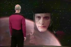 Q enters dressed as Christopher Columbus! And then a World War Two soldier! And then a late 21st century soldier who drugs himself!! The decision to include Q from the very beginning is an interesting one. We have a ship full of not just humans, but also other races from different planets. Troi is half Betazoid, Worf is Klingon, and Data is an android. Why Q thinks they and the other non-humans on the ship must go back to earth is never really explained. Also to have humanity at its very best, in the 24th century, judged as just as terrible and war hungry as those of us in the 21st was a bold move, when most of the appeal of Star Trek is the warm cozy feeling that in the end, humanity does ok. We aren’t truly as awful as history and the nightly news would have us believe. The inclusion of Q and the later courtroom scenes set in the late 21st century, (2079, according to Q), give us a glimpse of something we’re told about in the Original Series and movies, but don’t get to see.