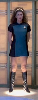 My second thought is Troi’s headband and original series length uniform! We’ll see her uniform change over time; they’ll give her pants eventually but what she gains in length will cause her neckline to plunge. Again, it feels like a little bit of a nod to the original series, but when you compare her uniform and demeanor to Tasha Yar’s, it feels like the show is clearly signaling that the demurer Troi is the one they expect men to be more attracted to. Her lines are much more simplistic as well, playing captain obvious when she shouts, “He’s frozen!” when the unfortunate red shirt does indeed fall, covered in ice.
